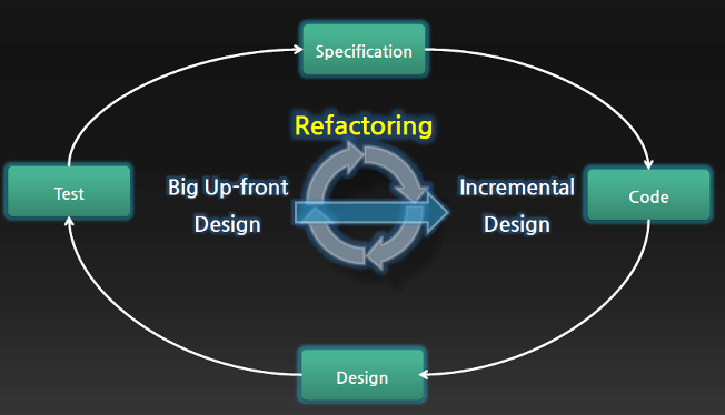이제 원래의 주제로 돌아 가자. 설계자와 구현자 간의 분할이 의미가 없고 설계와 구현이 동일한 활동이라면 결국 이것은 짜고 고치기(Code-and-Fix) 방법으로의 회귀를 의미하는 것은 아닌가? 그렇지는 않다. 오히려 애자일의 권고는 ‘설계하지 말라’가 아니라 ‘언제나 설계하라’다. 피드백 주기가 길어지는 사전 설계(Big Up-front Design)대신 피드백 주기가 짧은 TDD(Test-Driven Development)를 적용하라. 그리고 리팩토링(Refactoring)을 통해 설계와 코드를 지속적으로 개선함으로써 코드를 항상 최상의 상태로 유지하라. 점진적인 설계 사이클을 도입함으로써 설계와 구현을 독립적인 활동이 아닌 상호 영향을 주고 받는 유기적인 절차로 바라볼 수 있게 되었다. 따라서 경험을 기반으로 한 지속적인 리팩토링을 통해 최적의 소프트웨어의 설계를 얻을 수 있다.