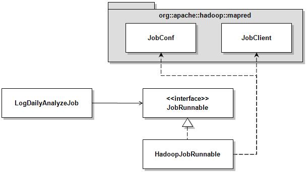 우선 LogDailyAnalyzeJob의 인프라스트럭처에 대한 의존성을 제거하자. Apache Haddop에 대한 의존성을 끊는 가장 간단한 방법은 JobConf와 JobClient에 대한 의존성을 특정한 클래스 내부로 고립시키는 것이다. JobConf와 JobClient를 다루는 모든 코드를 별도의 인터페이스와 클래스로 추출하여 LogDailyAnalyzeJob이 오직 인터페이스에 대해서만 의존하도록 코드를 리팩토링한다.