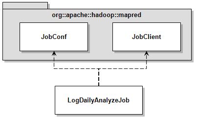 import org.apache.hadoop.mapred.JobClient; import org.apache.hadoop.mapred.JobConf; ... public class LogDailyAnalyzeJob { public void analyze(String[] parameters) throws Exception { JobConf conf = new JobConf(LogDailyAnalyzeJob.class); ... conf.setJobName("LogDailyAnalyzer : " + parameters[0] + " for " + parameters[1]); conf.setMapperClass(BasicMapper.class); conf.setCombinerClass(BasicCombiner.class); conf.setReducerClass(analyzer.getReducerClass()); ... String year = parameters[1].substring(0,4); String month = parameters[1].substring(4,6); String day = parameters[1].substring(6); String path = "/"+year+"/"+month+"/"+day; conf.setInputPath(new Path("/user/statlogs" + path)); conf.setOutputPath(new Path("/user/result" + path + "/" + parameters[0] + "/daily")); ... JobClient.runJob(conf); } }<리스트 1> Apache Hadoop에 대해 강한 의존 관계를 가진 클래스