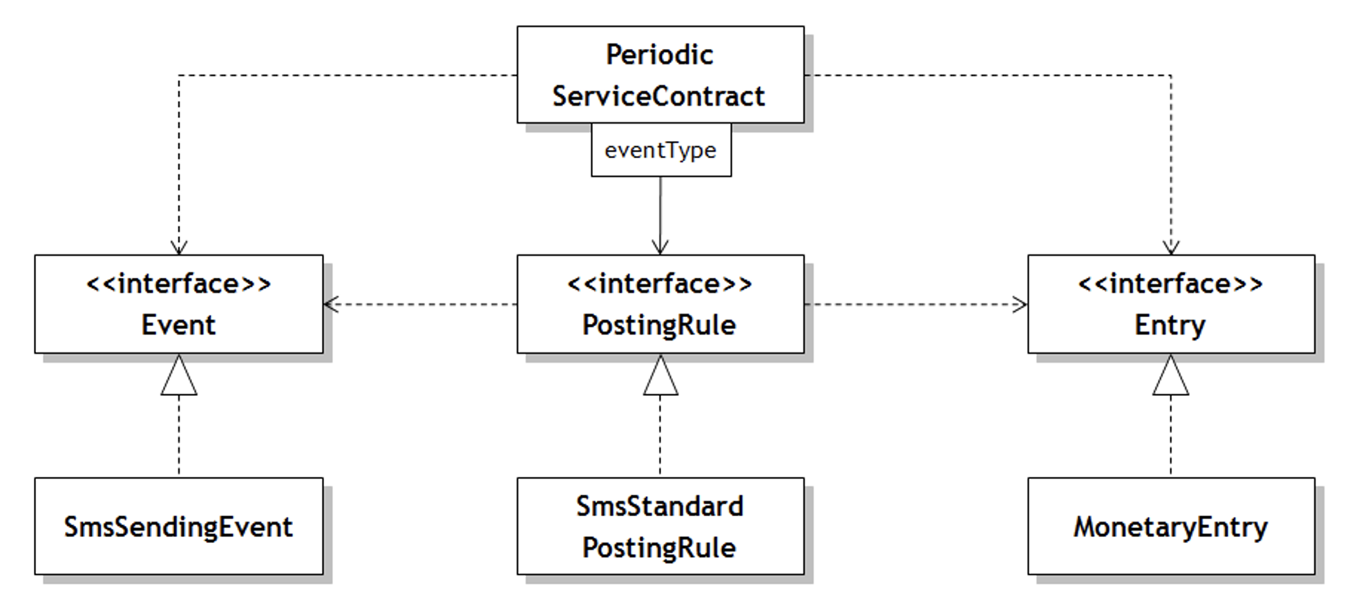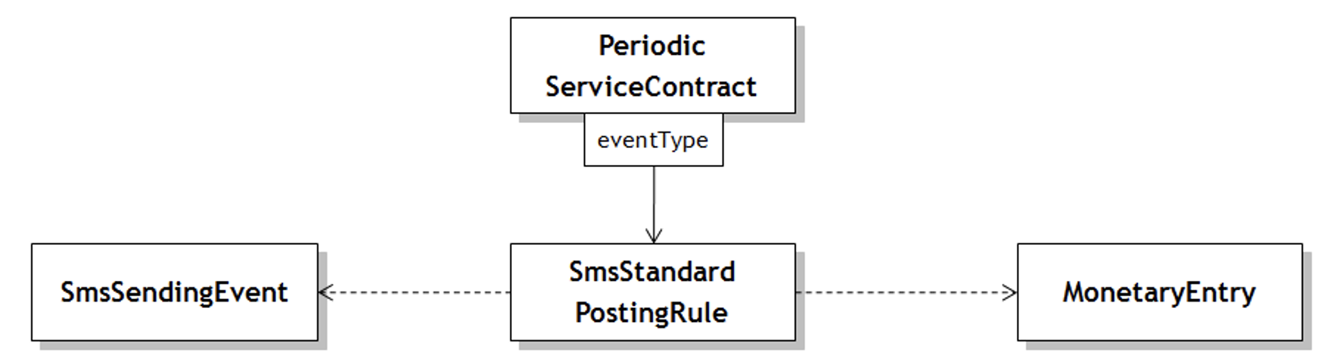 <그림 1>은 통화 요금을 계산하는 상위 정책인 PeriodicServiceContract가 세부적인 SmsStandardPostingRule, SmsSendingEvent, MonetaryEntry와 강하게 결합되어 있는 전통적인 의존 관계를 표현한 것이다.