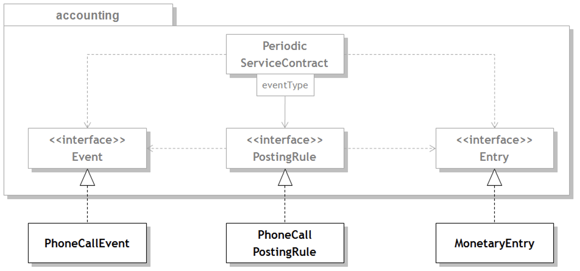 이제 <그림 3>과 같이 상위 정책인 PeriodicServiceContract와 추출된 인터페이스를 별도의 패키지로 묶어 보자. DOMAIN EVENT와 ACCOUNTING ENTRY의 인터페이스는 상위 정책의 필요에 의해 결정되기 때문에 상위 정책에 속한다. 즉, 인터페이스와 구현 클래스를 별도의 패키지로 분리해야 한다. 이처럼 재사용을 위해 인터페이스와 구현 부를 별도의 패키지로 분리하는 것을 SEPARATED INTERFACE 패턴이라고 한다. 상위 정책과 인터페이스를 포함하는 패키지는 전체 애플리케이션에 있어 프레임워크로서의 기능을 제공한다.