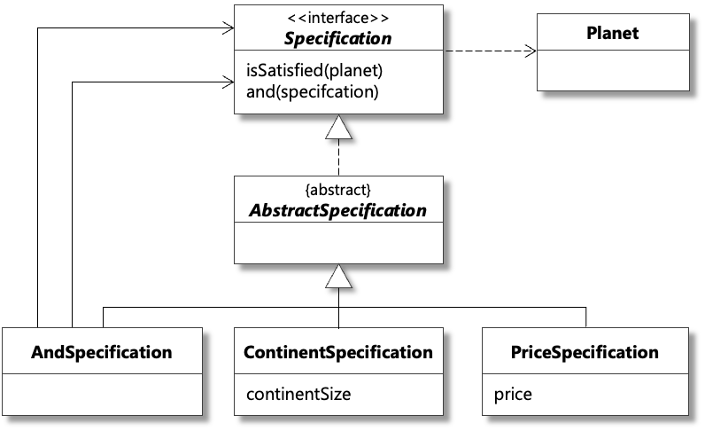 public interface Specification { boolean isSatisfied(Planet planet); Specification and(Specification other); }