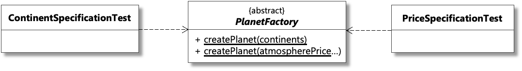 이 테스트 케이스의 결과와 관련된 Planet의 상태 정보는 Ocean뿐이다. Atmosphere와 Continent 정보는 테스트와는 상관없이 Planet의 생성자가 요구하기 때문에 컴파일 에러를 방지하기 위해 생성하는 것뿐이다. 따라서 Ocean만을 인자로 받고 그 외의 정보는 기본 값으로 할당하는 매개변수화된 생성 메서드를 PlanetFactory에 추가하고 이를 호출함으로써 테스트 케이스의 가독성과 유지보수성을 향상시킬 수 있다.